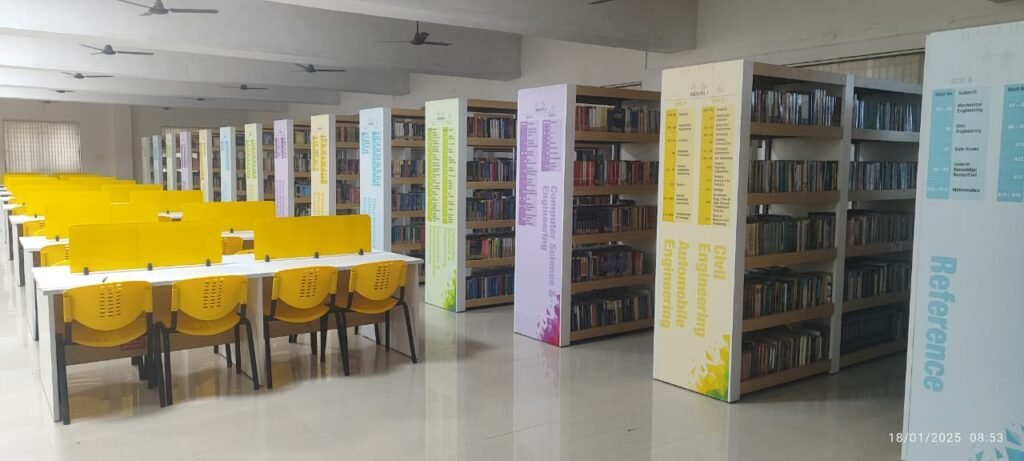 The College library is located in a spacious new building of 9000 Sq. ft. The library is open to students and staff members from 9.00 a.m. to 6.00 p.m. on all working days. The library has a rich collection of around 52,600 volumes of text books, reference books, national and international journals in all branches of Engineering, Science, Technology, Management and General Studies, and the collection is ever increasing. The books are classified according to Dewey Decimal Classification Scheme. Open access system is followed in the library.