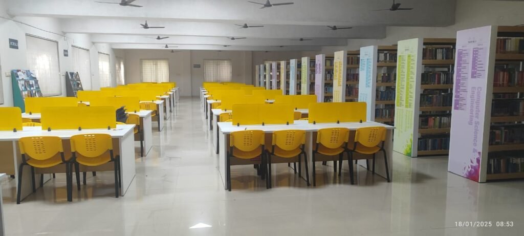 The College library is located in a spacious new building of 9000 Sq. ft. The library is open to students and staff members from 9.00 a.m. to 6.00 p.m. on all working days. The library has a rich collection of around 52,600 volumes of text books, reference books, national and international journals in all branches of Engineering, Science, Technology, Management and General Studies, and the collection is ever increasing. The books are classified according to Dewey Decimal Classification Scheme. Open access system is followed in the library.